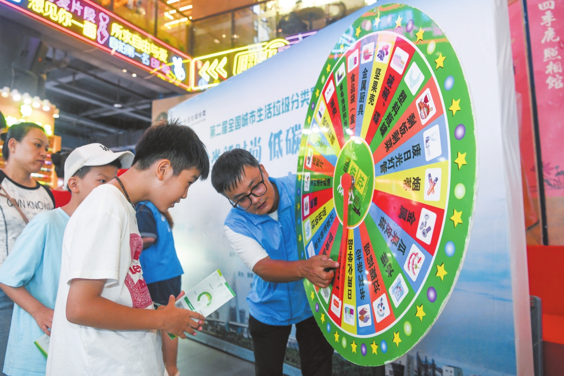 5月26日,在“分類新時尚·低碳齊參與”活動上,小朋友參加大轉(zhuǎn)盤游戲。 記者 楊鶴 攝