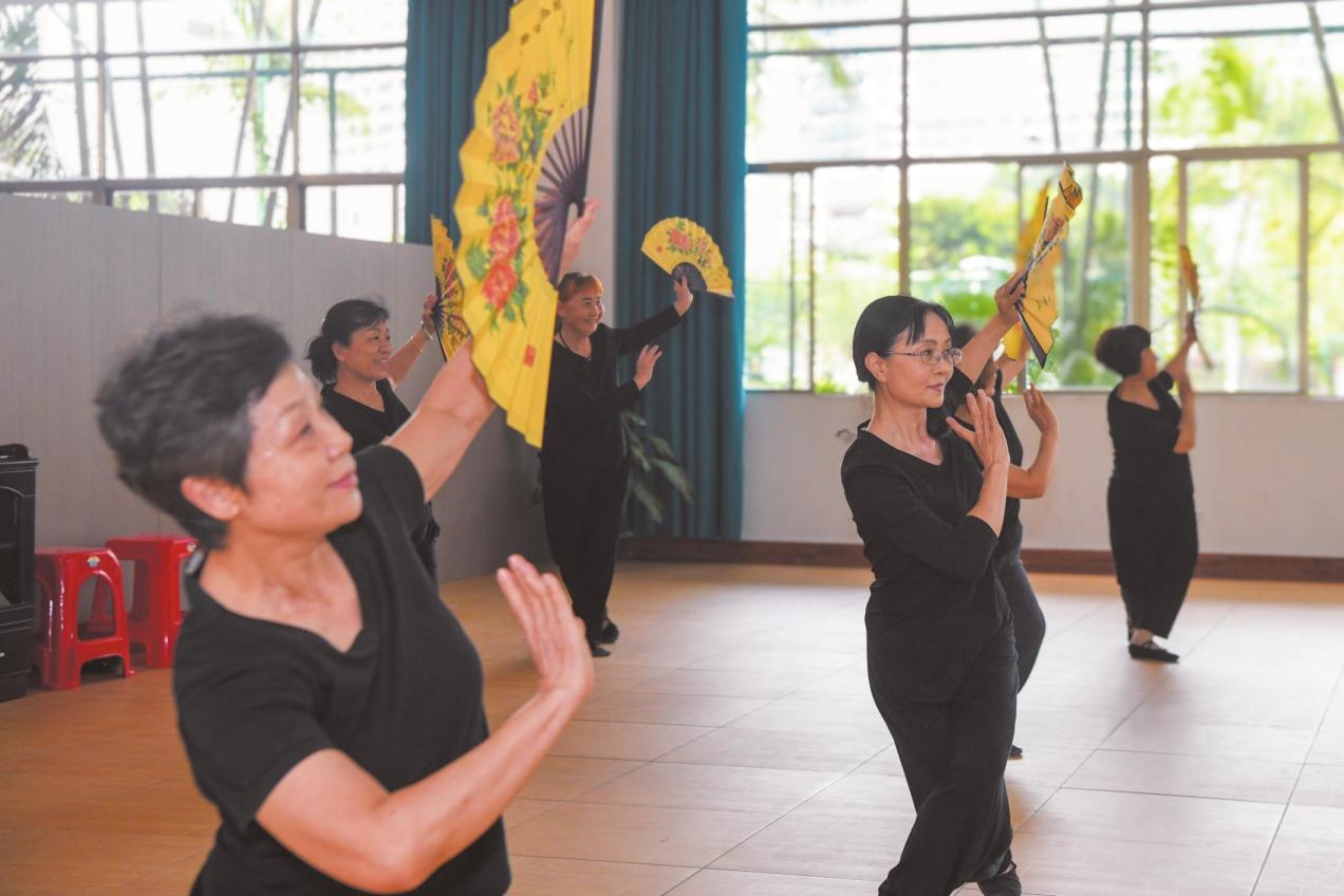 在四季華庭一期業(yè)主文化中心內(nèi),小區(qū)業(yè)主正跟隨著音樂(lè)練習(xí)扇子舞。