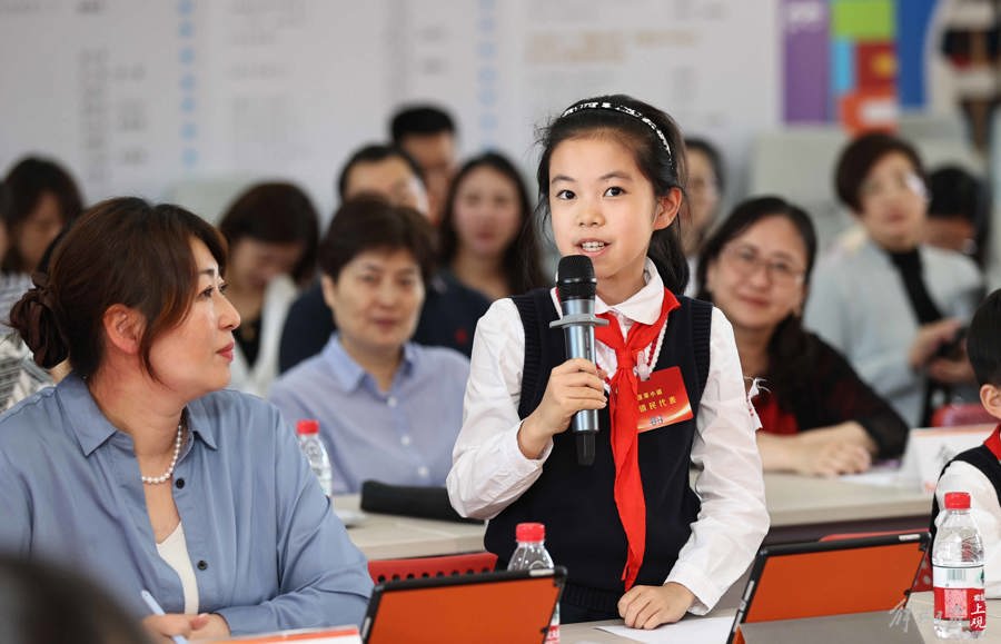 蓬萊路第二小學(xué)的孩子在向黃浦區(qū)婦聯(lián)、老西門街道負(fù)責(zé)人提出自己對(duì)兒童友好空間打造的建議。 蔡維帥 攝