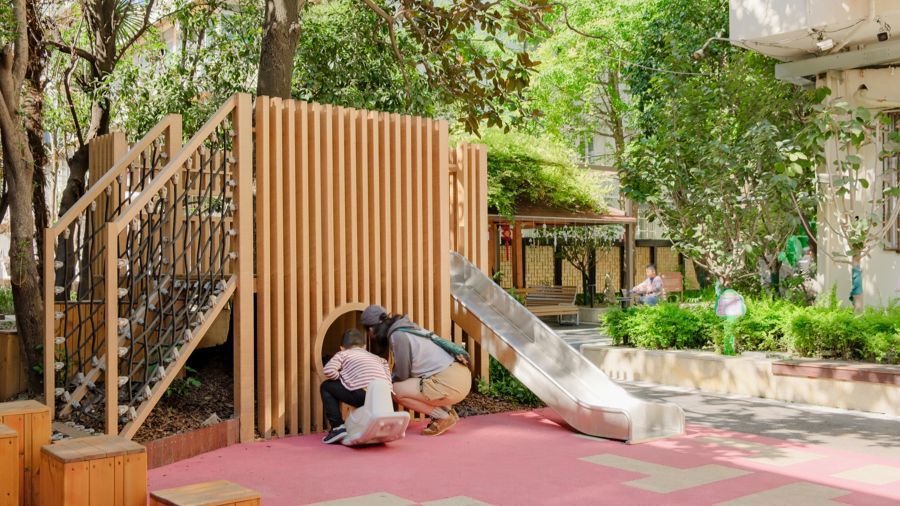 最終,設(shè)計(jì)師圍著一棵廣玉蘭和一棵小桂花樹打造了“兒童游戲區(qū)”,設(shè)計(jì)了小小的樹屋滑梯,提供爬網(wǎng)與木樁小山的雙重攀爬選擇。木樁小山背后設(shè)計(jì)了一個(gè)超大的黑板墻?!耙庀氩坏降摹糜谩>游刹扛嬖V我們,孩子們?cè)诤诎迳喜恢皇峭客慨嫯?,還能寫作業(yè)、算數(shù)學(xué)題?!?/p>
