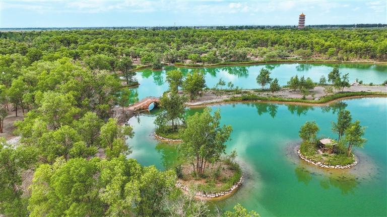 近日,在金塔沙漠胡楊林,清澈的湖水、蔚藍的天空與綠意盎然的胡楊林,共同繪成一幅夏日圖景。通訊員 曹紅祖
