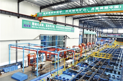 在這里,一輛報廢汽車被送上流水線,僅15分鐘就從整車變?yōu)樗槠?。破碎后的殘渣迅速進(jìn)入分選流水線,自動分類回收銅、鋁、塑料等材料,經(jīng)專業(yè)化處理可節(jié)能六成、節(jié)材七成,為下游企業(yè)提供低耗能、低排放、高效率的資源保障。