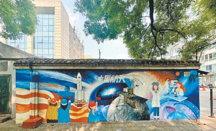 在地球和月球交相輝映的背景中,左側(cè)是火箭直沖云霄,右側(cè)是夜以繼日研究月壤的科學(xué)家們,中間主畫面是嫦娥六號(hào)登陸月背……在東鐵匠營(yíng)街道橫七條的墻面上,是北京市第十八中學(xué)實(shí)驗(yàn)學(xué)校許格老師帶著學(xué)生繪制的《宇宙漫想》2.0版。
