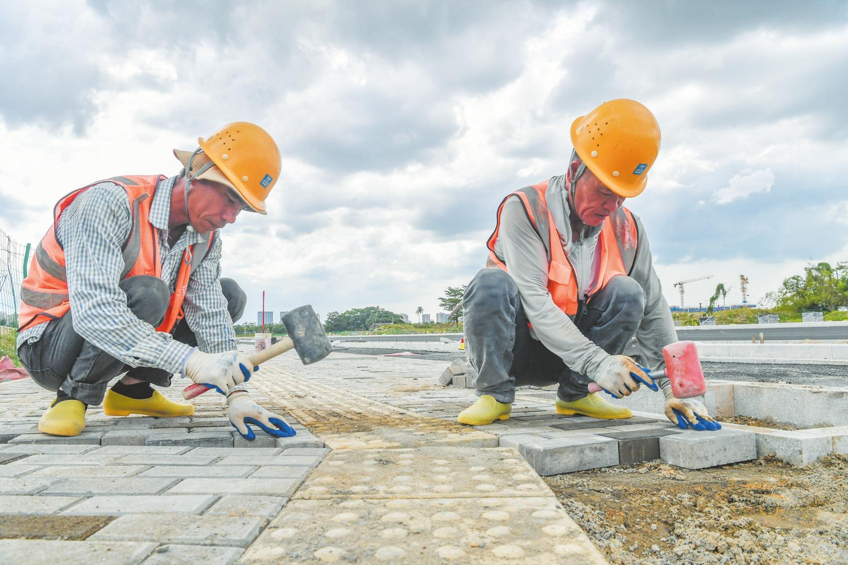 近日,在江東新區(qū)府越路項目西段,施工人員正在鋪設(shè)地磚。記者 孫士杰 攝