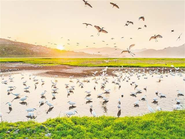 9月7日,重慶市開(kāi)州區(qū)漢豐湖國(guó)家濕地公園,優(yōu)美的生態(tài)環(huán)境,吸引了眾多鷺鳥(niǎo)來(lái)此覓食、追逐、嬉戲。