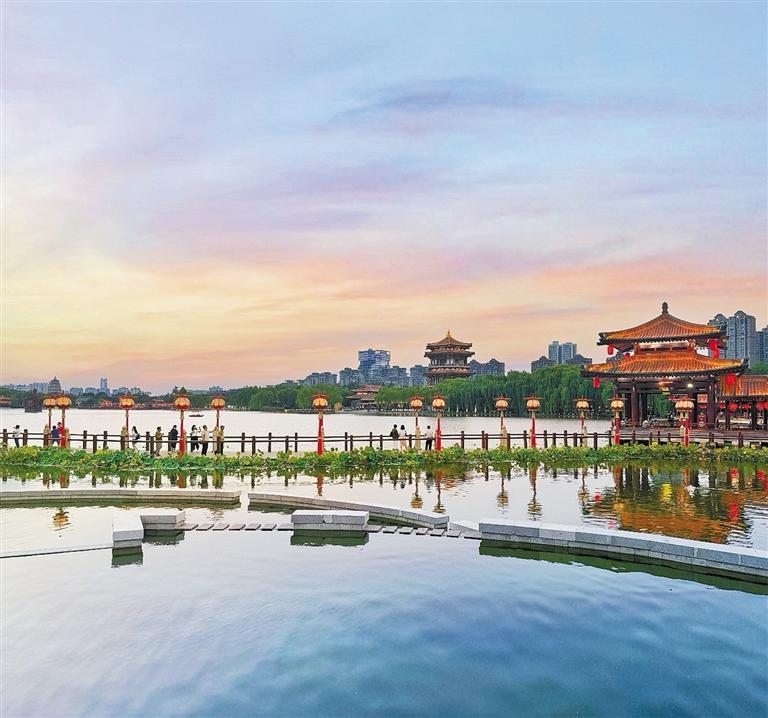 近年來,西安曲江池·大唐芙蓉園水利風(fēng)景區(qū)貫徹落實河湖長制,構(gòu)建完善管理體系,有效提升河湖管理效率與動態(tài)監(jiān)管能力,同時注重水資源集約利用,水環(huán)境保護(hù)治理取得顯著成效?!拔姨貏e喜歡這里的文化氛圍。水舞光影秀《大唐追夢》太震撼了!站在湖邊,濃郁的盛唐文化氣息撲面而來,令人心曠神怡?!眮碜陨虾5挠慰蛥翘煊畋硎荆@樣的體驗讓他更加喜歡西安。