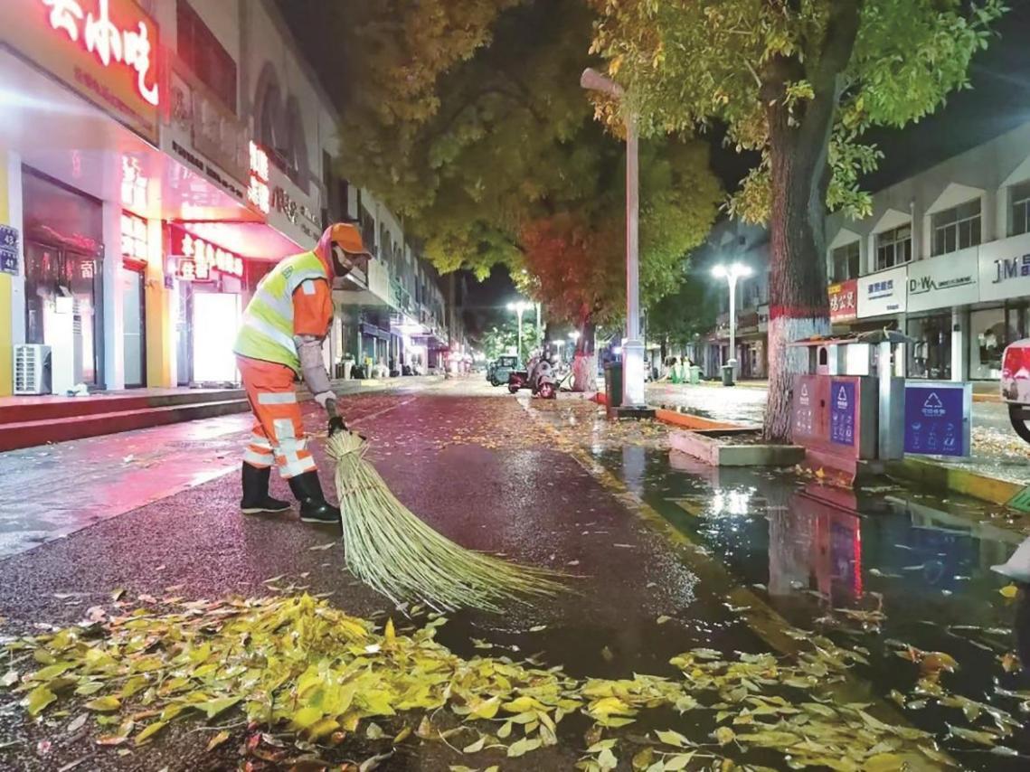 11月4日,環(huán)衛(wèi)工人清理道路落葉。