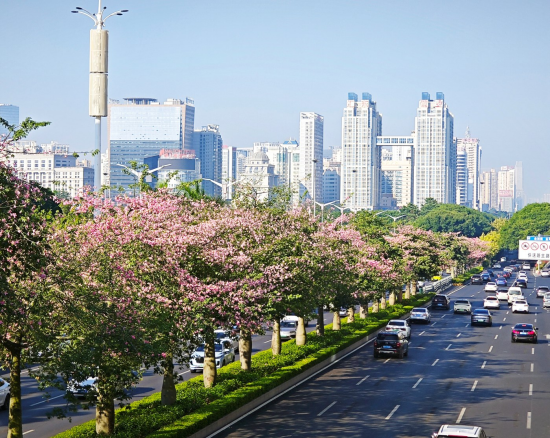 秋風(fēng)拂過,城市各條道路、橋梁兩旁,綠樹和各色花朵相互映襯,演繹著專屬綠城的秋日浪漫。綠城南寧,“綠”是不變的底色。民族大道兩旁,異木棉花開一路,在綠樹映襯下分外美麗。古城路綠樹成蔭,機(jī)動(dòng)車、行人穿行其間,陽(yáng)光從樹葉間灑下。百花嶺路兩旁的羊蹄甲花競(jìng)相開放,讓道路變成了花廊。邕城秋色中,又怎能少得了三角梅?良慶大橋上的三角梅熱情綻放,與從江上駛過的船只構(gòu)成了一幅寫意的畫卷……(記者 覃雨軒)