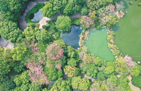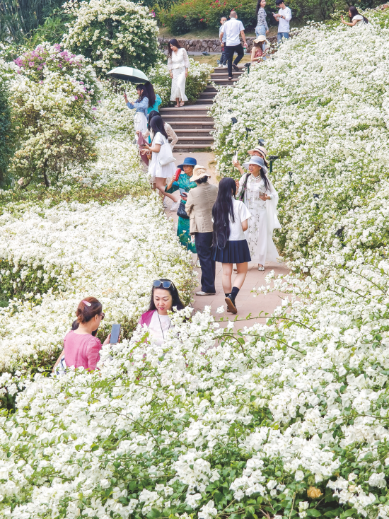 民族廣場(chǎng)上,孩子們?cè)谇锶张?yáng)下奔跑、與鴿子嬉戲;五象湖公園內(nèi),時(shí)??梢娛忻襁\(yùn)動(dòng)的身影,處處充滿無限的生機(jī)與活力;獅山公園里,落羽杉換上金黃色的“新衣”,仿佛秋天的使者,向人們傳遞季節(jié)的更迭;南湖公園里,蒜香藤形成紫色“瀑布”,讓人仿佛進(jìn)入一個(gè)紫色的夢(mèng)幻世界;青秀山風(fēng)景區(qū)層林盡染,人們?cè)谌~子花園里拍照打卡,在金杉湖邊漫步……