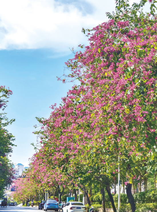 百花嶺路旁的羊蹄甲花競(jìng)相開放,把道路變成了花廊。記者 黃維業(yè) 攝