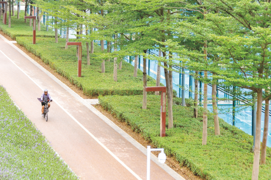 市民在邕江畔騎行,綠色相伴。記者 黃維業(yè) 攝