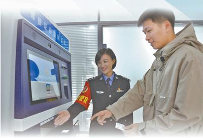 在天津市公安局南開分局向陽路派出所,民警幫助群眾通過駕駛證自助制證機辦理相關業(yè)務。