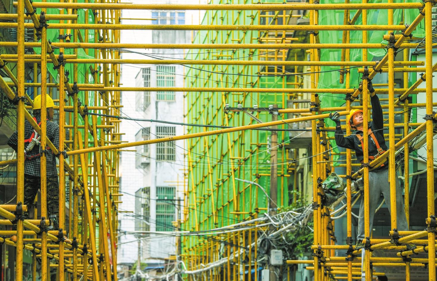 日前,在??隍T樓歷史文化街區(qū)少史巷內,施工人員在搭建腳手架。記者 康登淋 攝