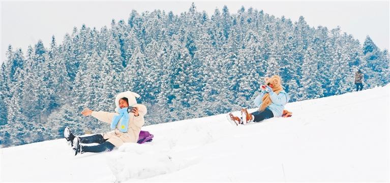 1月9日,重慶市酉陽(yáng)土家族苗族自治縣菖蒲草原景區(qū)銀裝素裹,游客在雪地運(yùn)動(dòng)。陳碧生 攝(中經(jīng)視覺)