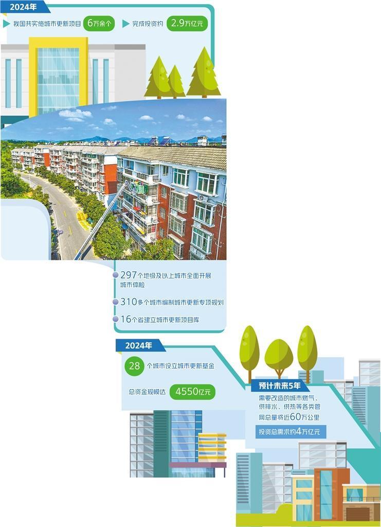 城市更新量大面廣。以城市重要的“里子工程”地下管網(wǎng)建設改造為例,預計未來5年需要改造的城市燃氣、供排水、供熱等各類管網(wǎng)總量將近60萬公里,投資總需求約4萬億元。