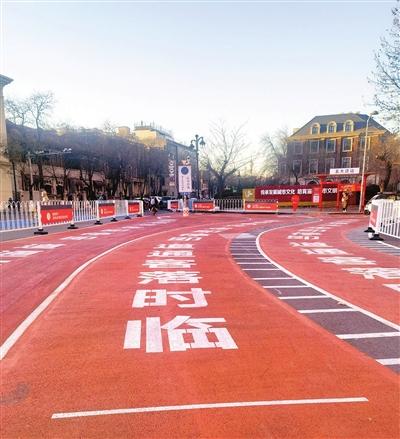 “年輕人偏愛網(wǎng)約車,又是出游的主要群體。以前每逢節(jié)假日,總會出現(xiàn)車輛擁堵、秩序混亂的場景,尤其是交通管制時,河北路與成都道交口處常常因?yàn)闋I運(yùn)車的隨意??慷萑氚c瘓。我們多次調(diào)研,研究出設(shè)置臨時落客區(qū)的舉措?!敝ш?duì)負(fù)責(zé)人介紹,該區(qū)域共設(shè)置了3條臨時落客通道,地面刷著紅漆,印有“臨時落客通道,即停即走”的字樣,車道用白色圍欄隔開,車輛互不影響,圍欄上也掛有提示牌“車道擁堵,請司機(jī)師傅勿在此長時間停留”,路邊立有一個崗?fù)?,這是游客上下車等待區(qū)域。