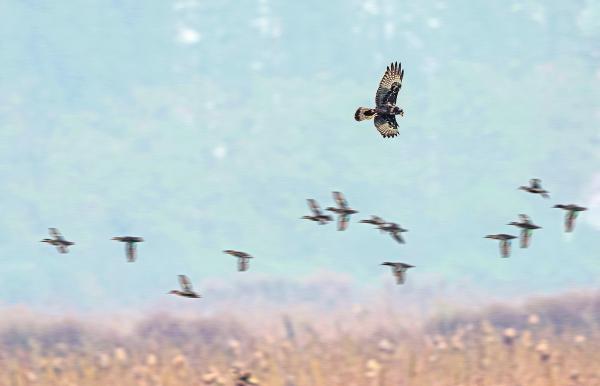 2024年12月15日,岳陽市屈原管理區(qū)營田鎮(zhèn),國家二級保護(hù)動物白腹鷂在空中巡視,一群綠翅鴨從它腳下快速飛過。