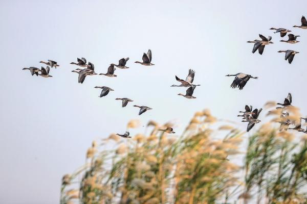 1月24日,岳陽市采桑湖,一群短嘴豆雁眾星拱月般地圍繞著兩只國家二級保護(hù)動物灰鶴,灰鶴當(dāng)仁不讓,居中飛行。