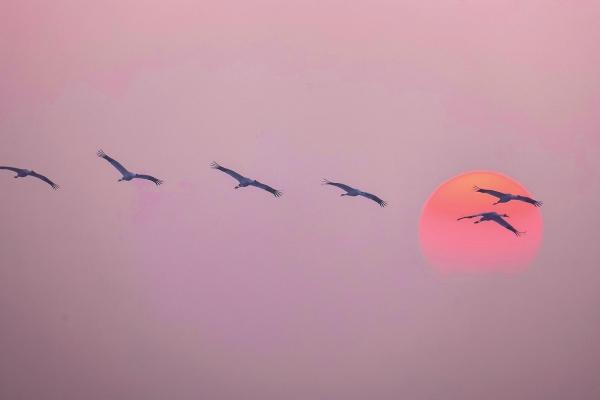 1月8日,臨湘市黃蓋湖,國家一級保護(hù)動物白鶴穿日而過。白鶴全球數(shù)量6000多只,繁殖于西伯利亞,長江中游是其最重要的越冬地。