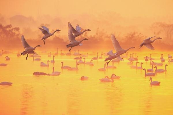 晨霧中,小天鵝舒展修長脖頸,在水面上優(yōu)雅起舞。來自西伯利亞的小天鵝連續(xù)5年來到岳陽市屈原管理區(qū)“打卡”,數(shù)量從1000多只增加到3000多只。