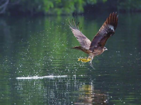 1月27日,長沙市雨花區(qū)跳馬鎮(zhèn),國家二級保護(hù)動物黑鳶在空中盤旋,發(fā)現(xiàn)魚浮出水面,迅速俯沖將其捕獲,然后帶到安全的地方享用。
