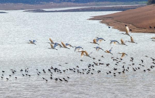1月25日,岳陽縣麻塘垸,國家二級保護(hù)動物白琵鷺從一群鶴鷸上方翩然飛過。