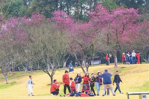 2月14日,南寧石門公園櫻花初綻,吸引了不少游客前來拍照留念。 記者 鄒財(cái)麟/攝