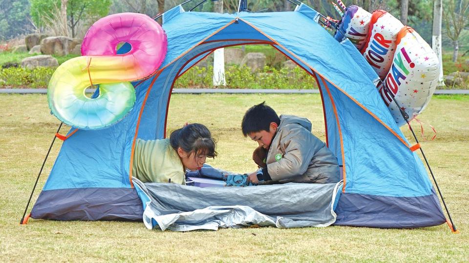 3月16日,在浙江省嘉興市植物園,小朋友在露營帳篷內看書。春回大地,人們紛紛走出家門,享受戶外活動的樂趣。從商場超市的露營商品專區(qū),到遍布城鄉(xiāng)的露營基地、公園綠地,“露營經濟”悄然升溫。(圖片均據(jù)新華社)