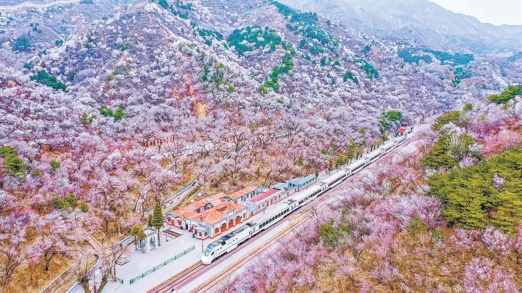 北京市郊S2線鐵路穿梭在爛漫花海間,給進(jìn)京旅客留下美好的“北京第一印象”。記者 潘之望 攝