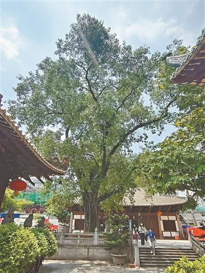 到了宋代,“光孝菩提”被列為“羊城古八景”之一。如今,六祖殿前,菩提榕生機(jī)勃勃,樹影婆娑。需要指出的是,今日光孝寺的菩提榕并非千年前的首棵菩提榕。這里另有故事。清嘉慶年間,智藥三藏手植的菩提榕被大風(fēng)刮倒,搶救無(wú)效。寺僧從南華寺取菩提榕枝條植于光孝寺。兩地菩提榕本出一脈,南華寺的菩提榕是早期從智藥三藏手植的菩提榕上取枝條種植而成的,系“子枝”;如此,今日光孝寺的菩提榕可謂是“孫枝”。