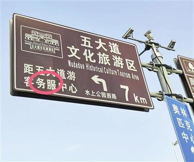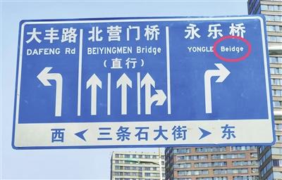 英文拼寫和翻譯的問題在天津市一些道路指示牌上也屢見不鮮。河?xùn)|區(qū)八緯路與北十五經(jīng)路交口,一塊地面立桿式道路指示牌上,“大直沽西路”的英文“west(西)”錯誤標(biāo)為“east(東)”;紅橋區(qū)河北大街永樂橋橋下的指示牌,將“Bridge(橋)”錯拼成“Beidge”;紅橋區(qū)西沽公園門口的一塊指示牌,將“丁字沽南大街輔路”英文翻譯成“Dingzigu South Auxlllary Rd”,誤拼的“Auxlllary”讓人難以理解?!拔也孪?,可能是要用‘Auxiliary(輔助的)’這個單詞?!焙颖惫I(yè)大學(xué)的一位學(xué)生說。