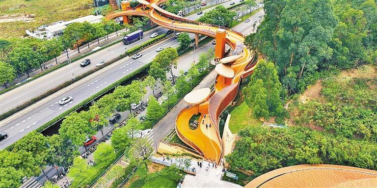 在目前深圳占地面積最大的兒童公園——龍崗兒童公園,門口飄來一條靚麗“彩帶”。這座人行天橋是公園的配套連接通道,橫跨公園門口的主干道鹽龍大道,將公園與周邊的商圈連通起來,實現(xiàn)“無縫”連接。帶著孩子到公園玩的胡先生表示,以前從商圈到公園需要等紅綠燈,過街時人群也比較雜亂,如今有了天橋,可以輕松到達公園門口,這么漂亮的天橋孩子們也很是喜歡。