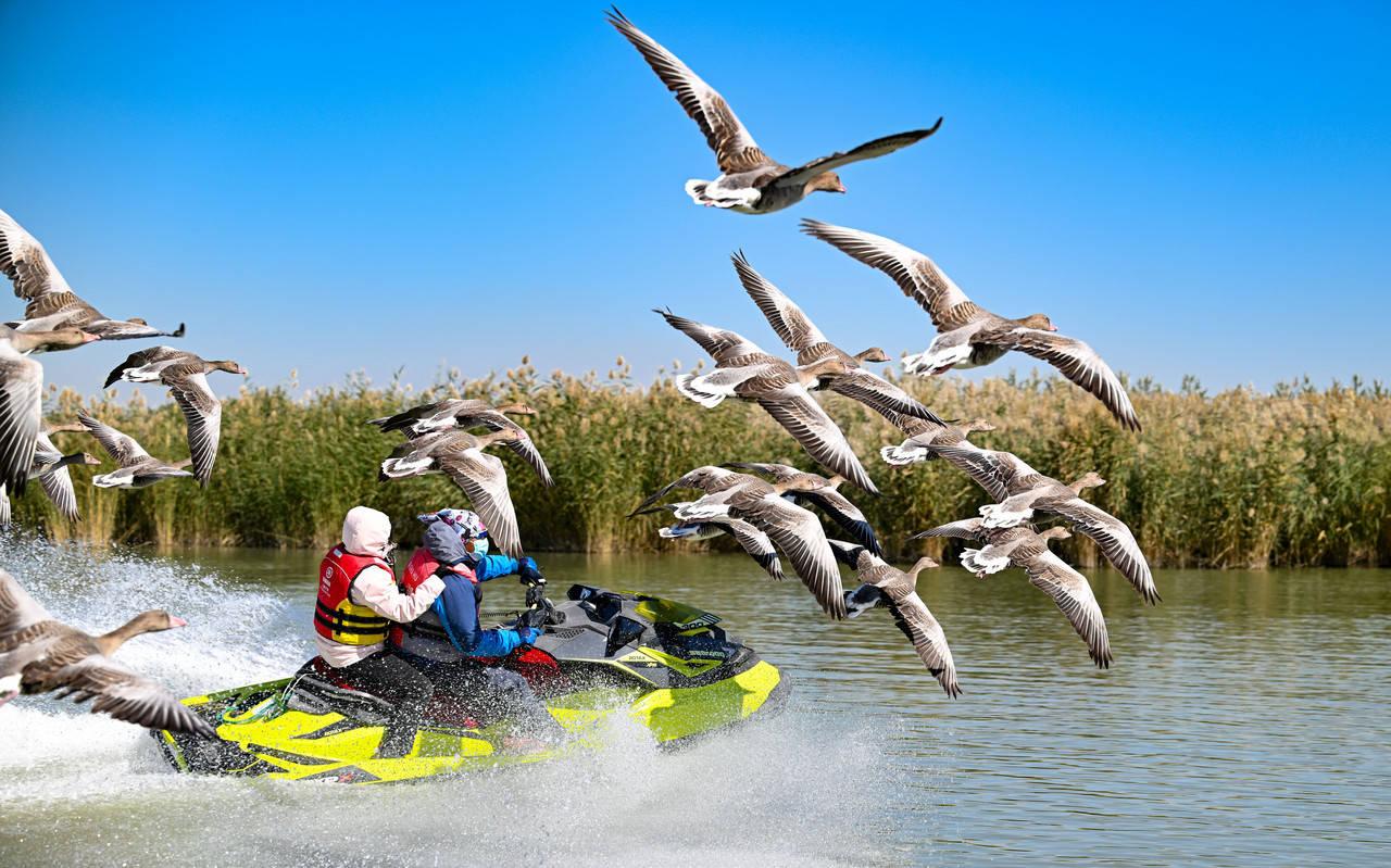 游客在沙湖景區(qū)乘坐快艇時大雁在一旁飛翔。當日是國慶假期的第二天,許多游客來到寧夏石嘴山市沙湖景區(qū),感受沙漠與湖泊相依的獨特景觀。新華社記者 馮開華 攝
