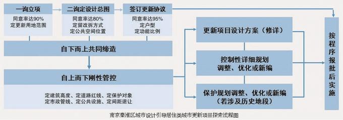 依據(jù)市級(jí)相關(guān)政策文件,結(jié)合項(xiàng)目實(shí)踐,南京秦淮區(qū)探索“自下而上多輪協(xié)商→自上而下規(guī)劃管控→修詳設(shè)計(jì)方案→控詳規(guī)劃優(yōu)化調(diào)整→初步設(shè)計(jì)→施工圖設(shè)計(jì)→建設(shè)實(shí)施→后續(xù)運(yùn)營(yíng)”聯(lián)動(dòng)管理機(jī)制??卦?、修詳規(guī)劃承接協(xié)商意見和管控要求,指導(dǎo)、支撐城市更新實(shí)踐。
