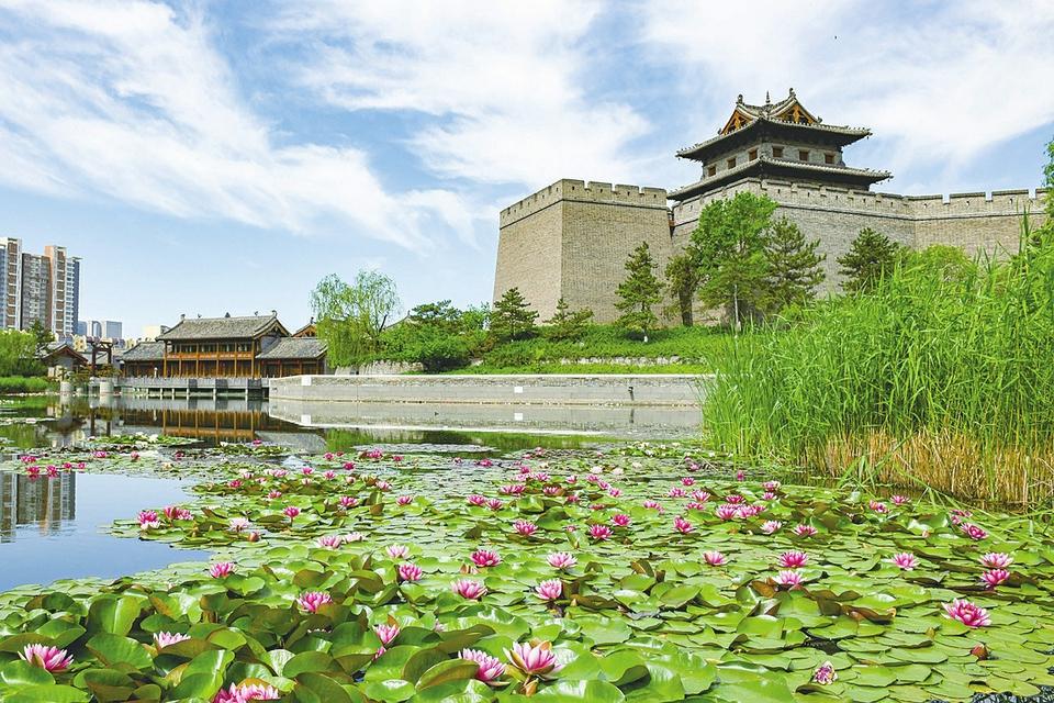 6月7日,在大同城墻帶狀公園東南角,護(hù)城河內(nèi)的大片睡蓮悄然盛開,與岸邊的綠樹、古城墻構(gòu)成一幅動靜相宜的美麗畫卷。戎禹仁 攝