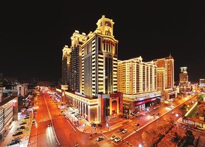 友誼南路夜色中的津典時代廣場(左)和蓮花酒店(右)如同璀璨的明珠