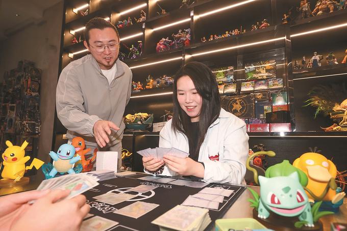 6月11日,南京市西城夜未央一家潮玩店,店主在指導(dǎo)客人玩卡牌游戲。小店定期組織卡牌對戰(zhàn)活動,將興趣與消費深度融合,吸引不少消費者光顧。記者 陳儼 攝
