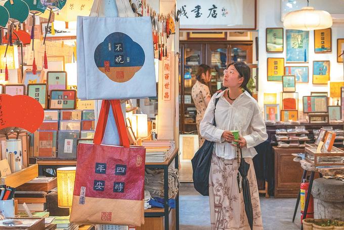 揚州皮市街的邊城書店,能買書還能體驗古籍修復(fù),古籍拼貼畫、錦灰堆等文創(chuàng)產(chǎn)品更是吸引不少年輕人到此親近傳統(tǒng)文化。劉江瑞 攝 (視覺江蘇網(wǎng)供圖)