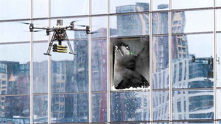 演習中,破玻無人機精準發(fā)射破玻彈擊碎幕墻玻璃,開辟排煙通道。