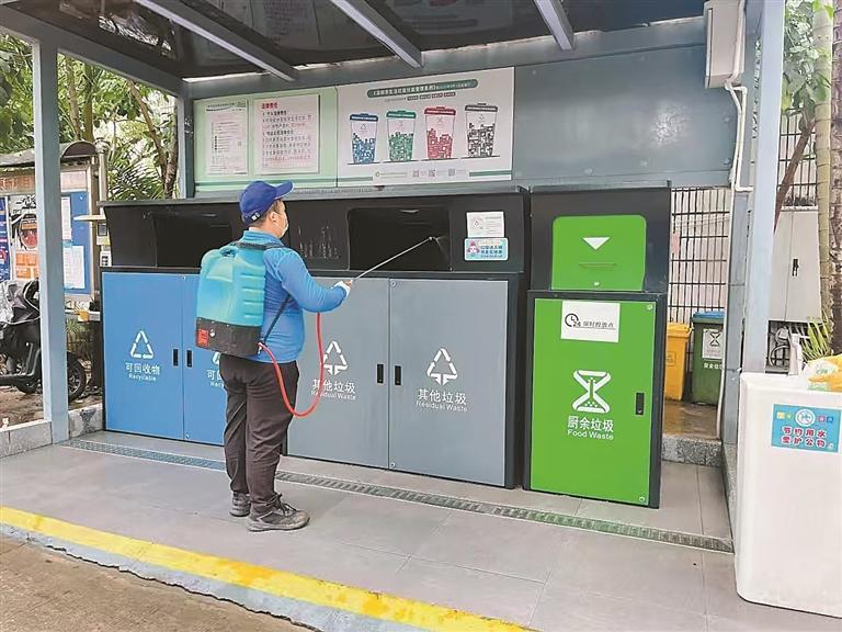 環(huán)衛(wèi)工人對垃圾分類投放點(diǎn)進(jìn)行消殺。
