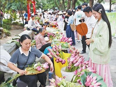 圖為市民游客在市集選購荷花。蘇州日報記者 倪黎祥攝
