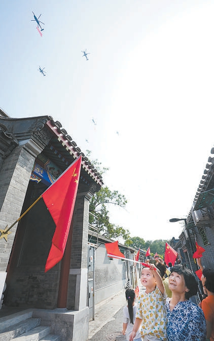 空中護(hù)旗梯隊(duì)飛過古巷上空。 記者 方非 攝