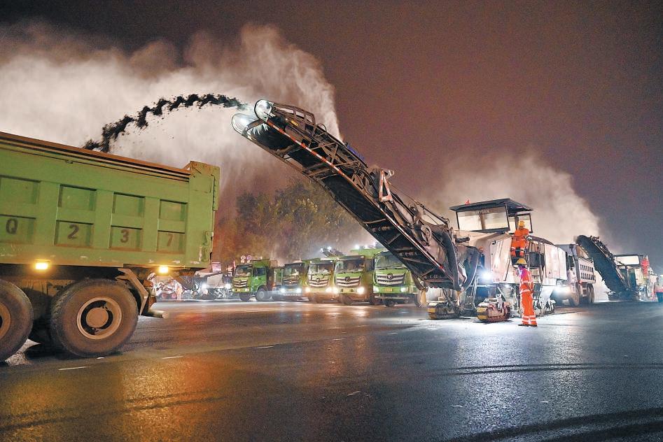 隨后,壯觀的一幕出現(xiàn)——在臨近長安街的東單、崇文門等大型路口,提前待命的大型渣土車、攤鋪車等發(fā)車,沿著指定路線,首尾相接地趕來,有序駛?cè)胧┕ざ?。一時間,長安街上機械轟鳴,熱浪蒸騰。隨著銑刨機車底的刀盤高速轉(zhuǎn)動,老化的道路面層被“鏟”去4厘米,再重新鋪上4厘米新型瀝青。路面最寬位置,8臺攤鋪機并肩作業(yè),它們身后還跟著十多臺壓路機。