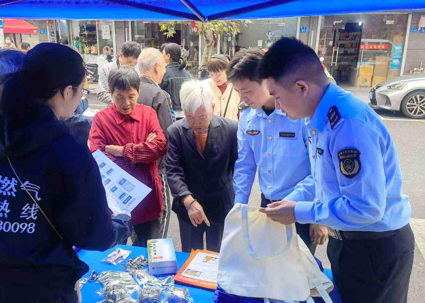 圖為執(zhí)法人員向居民發(fā)放宣傳冊