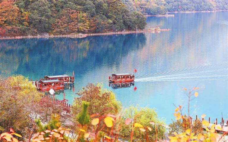 初冬時節(jié),甘肅省隴南市文縣天池國家森林公園層林盡染、碧波如鏡,吸引游客前來賞景游玩。通訊員 后斌玉