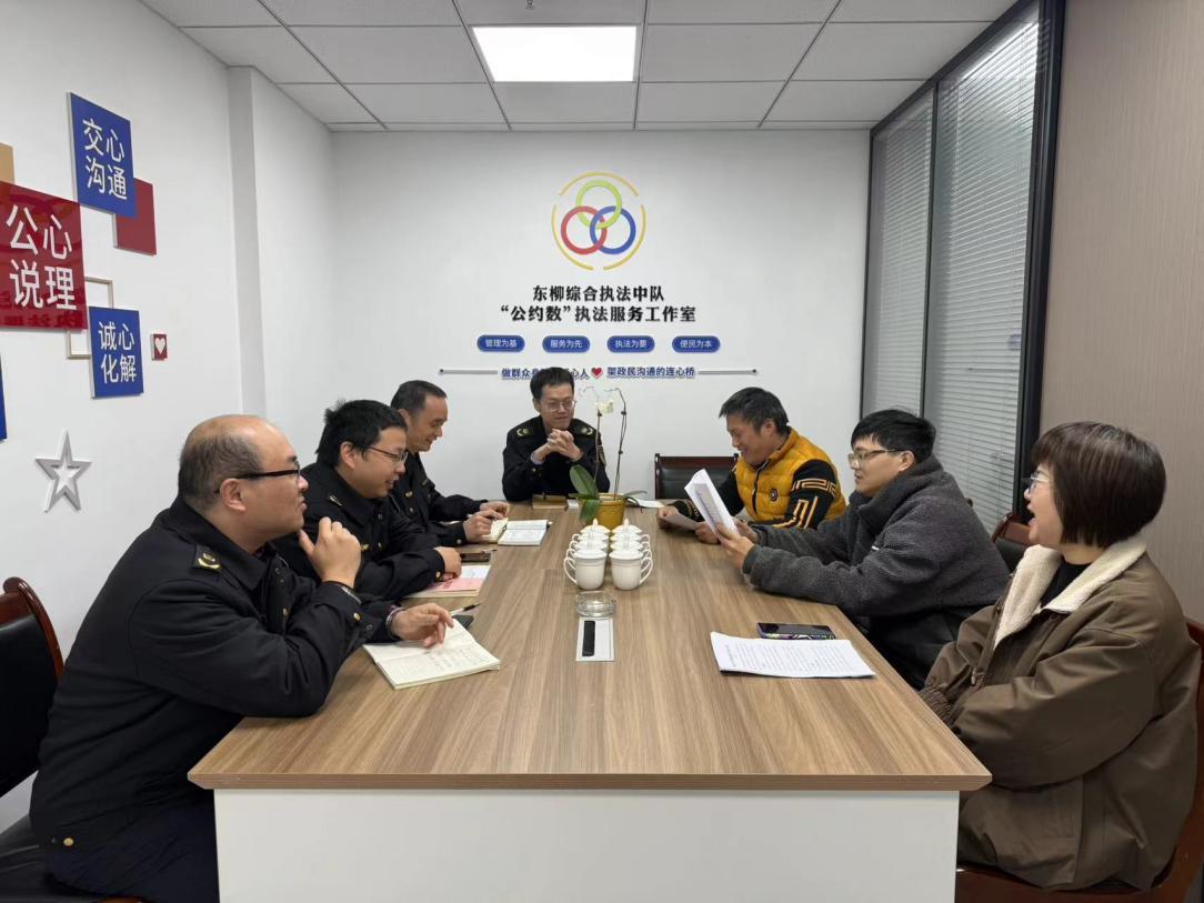 圖為東柳中隊在“公約數(shù)”執(zhí)法服務(wù)工作室與企業(yè)協(xié)商解決問題