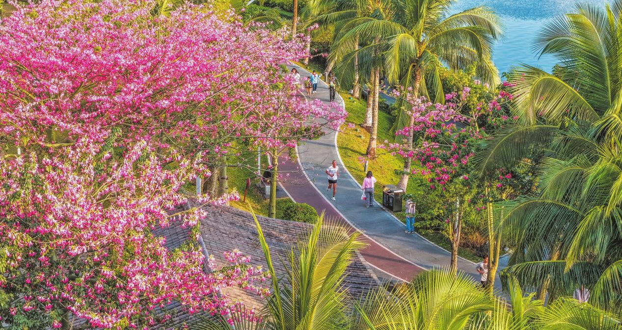 近日,??诩t城湖公園的異木棉進(jìn)入盛花期,滿枝花色絢麗,與椰林、湖岸相映成趣,為冬日添了一筆暖色,也為步道增添了浪漫氛圍。市民游客在其中或慢跑健身、或漫步賞花,一幅人與自然和諧相處的動(dòng)人畫(huà)卷在椰城鋪開(kāi)。(記者 康登淋 攝)