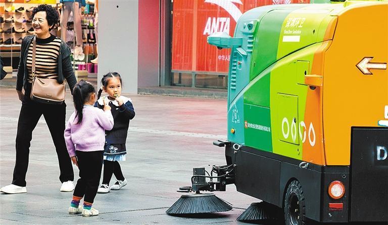 11月21日,智能環(huán)衛(wèi)機(jī)器人在步行街進(jìn)行清掃。