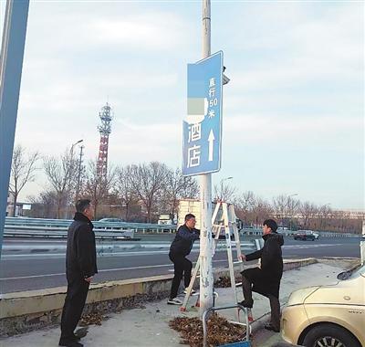 在北辰區(qū)志成路與津圍公路交會(huì)處的人行道上,一個(gè)印有“某某酒店歡迎您”的藍(lán)色廣告牌也設(shè)置在人行道上,十分顯眼。記者在東麗區(qū)津薊聯(lián)絡(luò)線徐莊村附近的路燈桿上,也看到一個(gè)印有“某某酒店”字樣的藍(lán)底白字廣告牌,在道路對(duì)面有一個(gè)印有“某某制冷配件進(jìn)口”字樣的廣告牌則設(shè)置在綠地上。