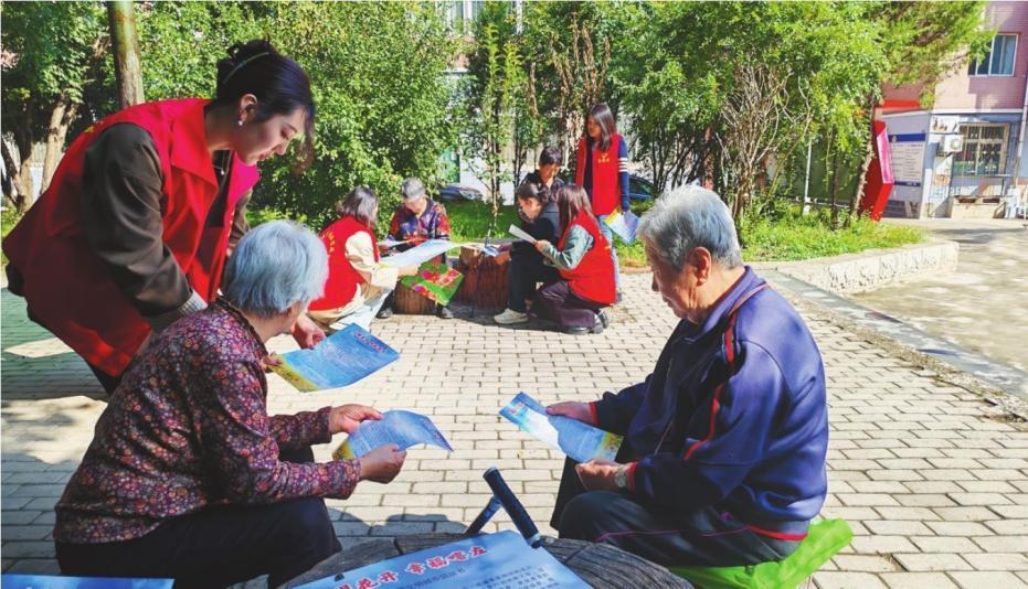 喀左縣志愿者向居民宣傳城市文明建設常識。 李娜 攝